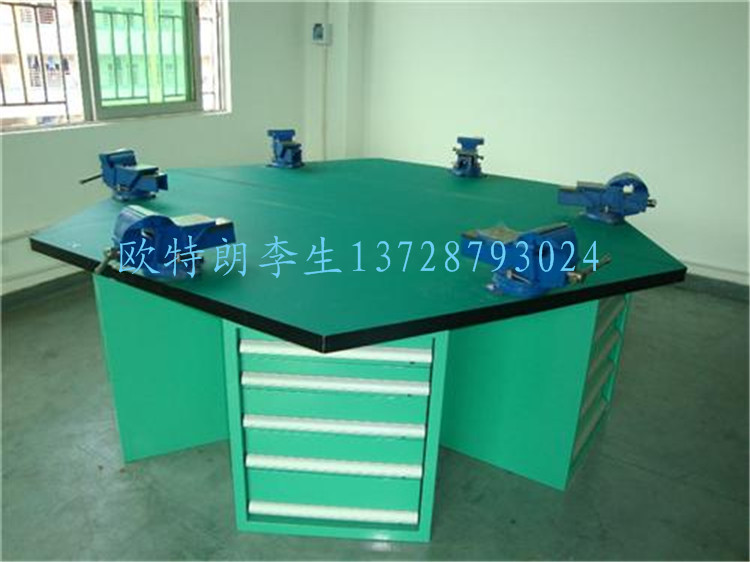 六角工作臺(tái)擁有六個(gè)工位,占地面積小,非常適合鉗工學(xué)校工廠的鉗工實(shí)訓(xùn)、鉗工操作;標(biāo)準(zhǔn)高度為800mm,單邊長(zhǎng)1.2米,直徑2.4米,適合中國(guó)工人的身高和工作效率,六角鉗工工作臺(tái):又稱(chēng)為鉗臺(tái),主要分為鉗工裝配平臺(tái),鉗工劃線平臺(tái),鉗工檢驗(yàn)平臺(tái)。